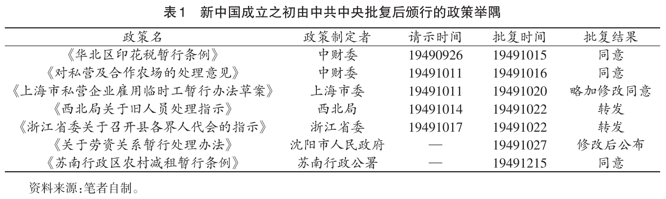 1948年12月15日,中共中央发出通知,“现各地高级领导机关有的已设有研究室,或类似机构,有的尚未建立。凡未建立者应即着手建立”。研究室的日常工作为“根据研究结果,秉承中央意旨,草拟各项指示、复电,或撰拟社论、短评、综合新闻及专门论文,编辑党内刊物、小册子”。这样一来,中央政策研究室负责制定政策草案,其由中共中央审定通过后成为具有效力的政策执行依据。中央及各(分)局的政策研究室成立后,中共的政策制定与发布趋于规范化。后来,中共基于请示报告制度,逐渐建立了一套极为高效的政策制定与颁行的模式。简单来说,各中央工作部门及各地党委、人民政府在调查研究的基础上制定各种暂行条例与办法,电告中共中央以进行请示。中共中央在收到这些政策的草案后,进行短则数天、长则近月的考虑与审核,再以电报形式批复,有时批复会附上修改意见。中共中央批复后,各中央工作部门与各级党委、人民政府正式颁布实施政策。此外,有时中共中央会直接转发其他中央(分)局及部分党委、人民政府所制定的政策,电令其他党政军机构参考。表1简单列举了新中国成立之初由中共中央批复后颁行的几个政策。