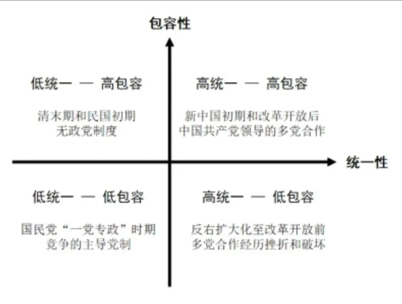 基于“统一”和“包容”二维分析,可以将自中国近现代第一个政党诞生以来的政党关系变迁史划分为四个阶段。自中国近现代第一个政党诞生至1927年土地革命战争之前,中国的政党刚刚兴起,尚未形成规范政党活动的现代政党制度,因此政党活动处于低统一、高包容的无制度时期。国民党右派在党内占上风后,开展了对中国共产党等政党的打压和清剿,虽然力图达到“一党专政”的目标,但始终未能实现政治上的统一,因此可划分为低统一、低包容的竞争型主导党制。新中国成立初期,虽然未正式确立政党制度,但是中共领导人对于开展多党合作保持较为开放的态度,和改革开放后逐步正式确立的新型政党制度都可以划入中国共产党领导的多党合作制之下。而在1957年反右斗争扩大化开始后,至“文革”结束,多党合作则处于受到挫折破坏和曲折前进的状态。