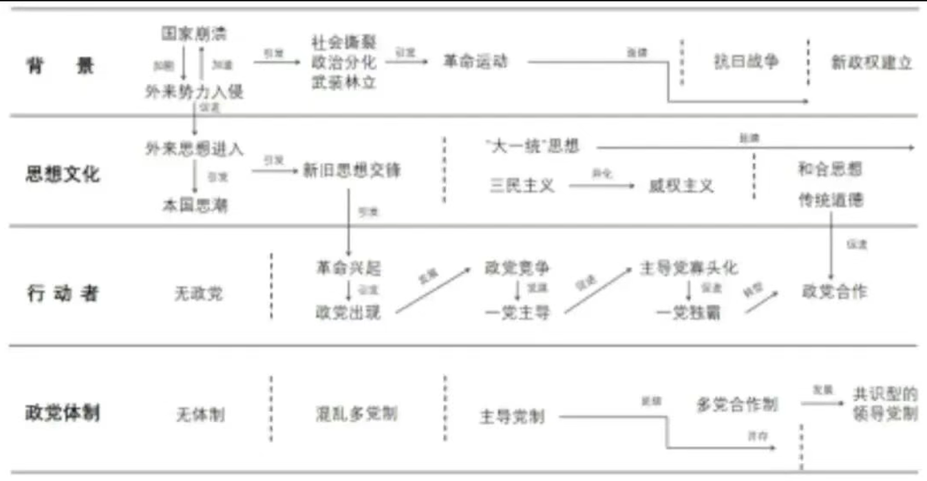 总结学界对于中国新型政党制度的文化理论研究成果,可以发现多数学者要么选择在静态比较中总结制度差异的文化根源,要么从政党制度的现状阐释其蕴含的中华传统文化基因。然而,这样的分析方法存在两点不足:一是对文化与制度的关系处理缺乏严谨性,将政党制度的对比转化为中西方文化的对比,可能在话语的自我构建中产生具有价值倾向性的先验判断;二是缺乏对中华传统文化影响政党制度的机制研究,可能造成传统政治的规范价值与现代政党制度的生硬联系。因此,必须基于历史政治学的研究方法,通过搭建诸要素的互动框架分析文化在制度形成过程中发挥的作用。