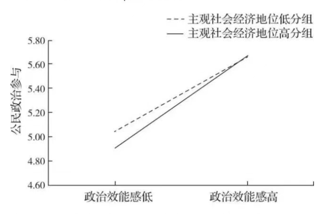 图2 政治效能感与主观社会经济地位的交互作用图