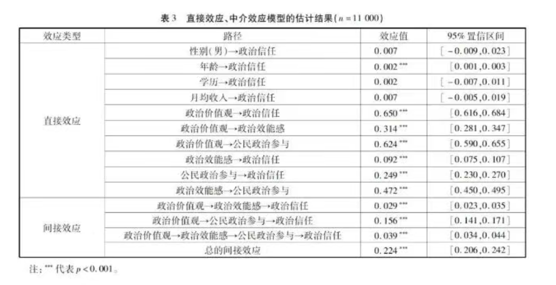 综上,本研究认为,政治价值观提高了人们的政治效能感,进而增强了人们的政治信任。