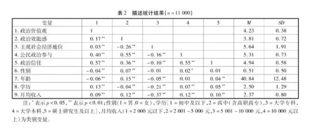 关键词:政治价值观;政治效能感;公民政治参与;政治信任;主观社会经济地位