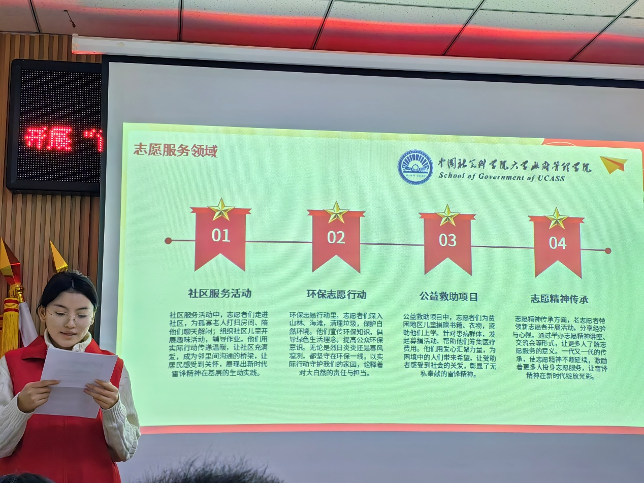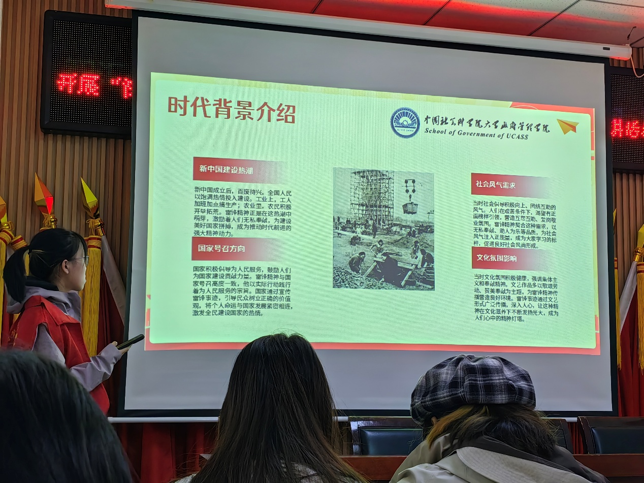 于林祎同学娓娓道来雷锋精神的起源与背景。回顾本次经历,她在感想中提到:“这次参与学雷锋主题宣讲志愿服务,通过讲解传递雷锋精神,加深了对雷锋奉献精神的理解。以青春之声传递正能量,收获满满,也更体现了新时代青年的责任与担当。”